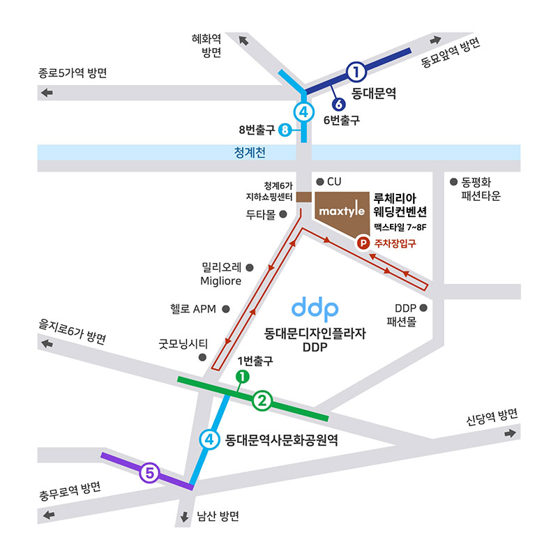 주소 및 연락처 Address 도로명 주소중구 마장로 3 맥스타일7~8층 루체리아웨딩컨벤션 지번 주소서울 중구 신당동 773 대표전화 02-3298-5064 팩스번호 02-3298-5084 티맵 바로 연결 → 카카오맵 바로 연결 → 네이버 지도 크게 보기 → 약도 및 교통 안내 지하철 이용시 1호선4호선 동대문역 (1호선) 6번 출구, (4호선) 8번 출구 (1호선) 6번 출구 → DDP방향으로 도보 4분 → 맥스타일 8층 (4호선) 8번 출구 → 청계6가 지하쇼핑센터 2번 입구 → 맥스타일 지하상가와 연결 8번 출구를 이용하시면 에스컬레이터를 이용하여 편하게 오실 수 있습니다. 2호선4호선5호선 동대문역사문화공원역 1번 출구 DDP방향으로 도보 6분 → 맥스타일 8층 버스 이용시 동대문역.흥인지문 정류장 하차 정류장 하차 [01037] 간선버스 101, 103, 111, 201, 260, 262, 270, 262, 270, 271, 370, 720, 721번 지선버스 2112번 광역버스 9301번 공항버스 6002번 동대문역사문화공원 정류장 하차 [02174] 간선버스 105, 144, 152, 261, 301, 420번 지선버스 2012, 2015, 2233, 7212번 실시간 버스노선 약도 인쇄 및 다운로드 약도 인쇄하기 약도 다운로드(PDF) 자가용 이용시 네비게이션 : "루체리아웨딩컨벤션" 또는 "맥스타일" 입력 티맵 바로 연결 카카오맵 바로 연결 [주소 검색] "서울 중구 마장로 3" 또는 "신당동 733" 주차장 안내 : 동시 500대 주차 가능 / 지하 3층 ~ 지하 7층